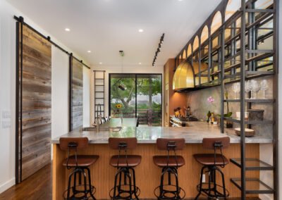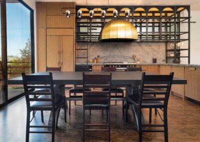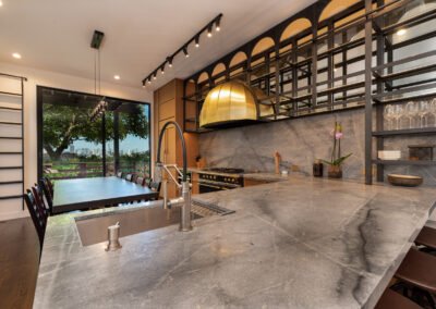 This full home remodel was a real test for our team but we pulled it off with flying colors. We took the necessary time to coordinate all the fine details between our electrical and plumbing teams and our custom cabinet and metallurgy teams. The result was a stunning master kitchen installation that brought multiple high level details together and culminated with this stunning space that is now cherished for both personal use and entertaining guests. We gutted the entire space and flattened all the ceilings and walls to make sure every surface was perfect for our new installation. We flew the custom stove in from France and spared no expense here making sure the homeowners could utilize every aspect of their vision to produce extremely high quality fare. We had the metal specialist mold the decorative brass hood to integrate with the finish of the stove and we dialed the shelving finish in to integrate with the anodized finishes of the sliding doors. Finally, we tied in the finish frame of the dining table to align with the rest and the result is this gorgeous space that combines powerful industrial elements with soft, warm wooden and stone elements giving a sense of high level urban restaurant meets the comforts of home.